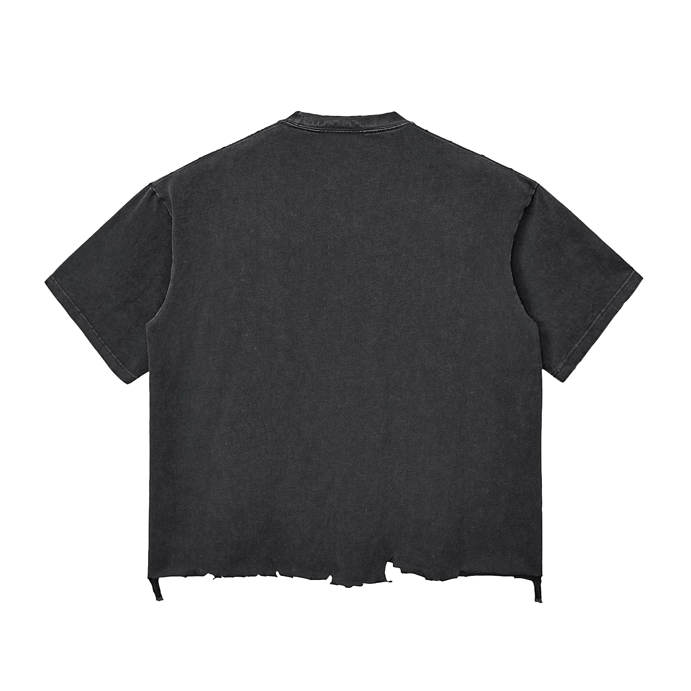 Heavy-weight 100% cotton with a refined texture that softens with wear. The relaxed boxy fit and intentional distressing create understated character. Engineered for durability and designed as a reliable wardrobe essential.